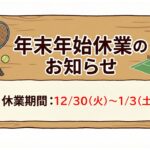 - 年末年始休業日のお知らせ年末年始は以下の日程にて休業させていただきます。ご了承のほど、よろしくお願いいたします。 12/30(火)〜1… 続きを読む: 年末年始休業日のお知らせ
